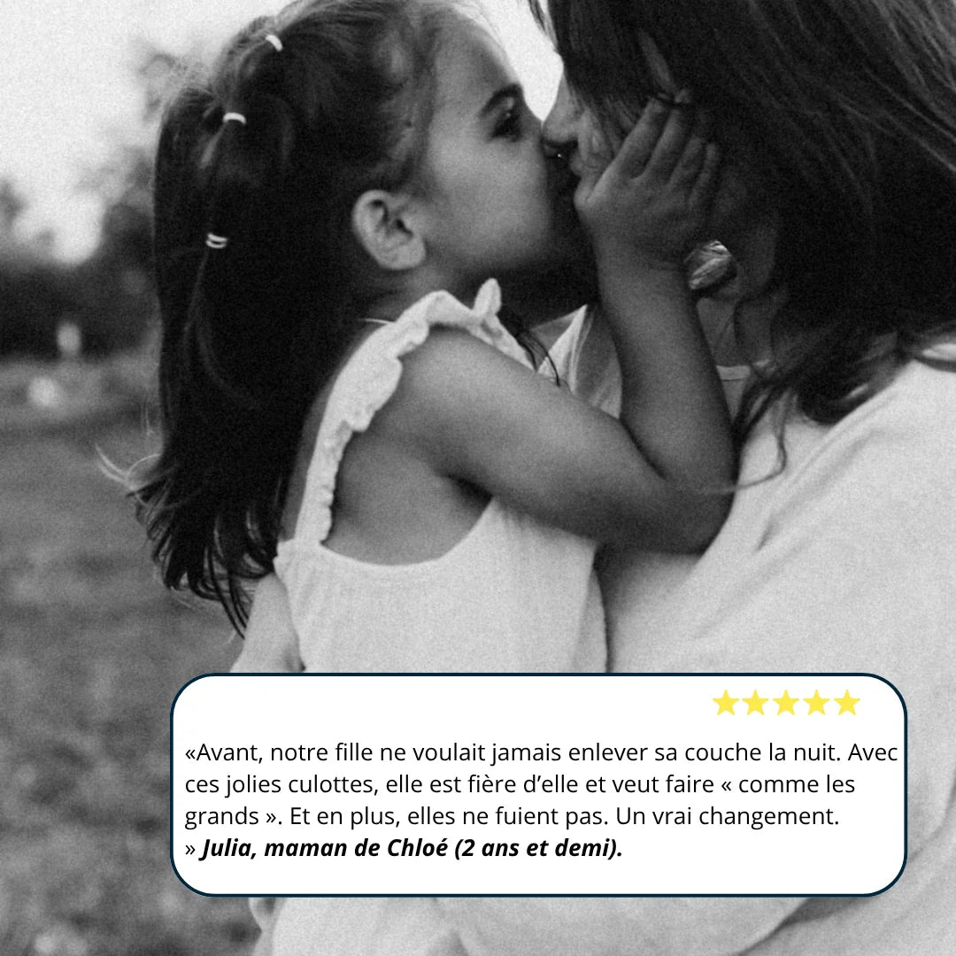 “Mon fils avait encore régulièrement des accidents la nuit, et les couches classiques commençaient à freiner ses progrès. J’ai voulu tester une alternative plus douce, plus proche d’un vrai sous-vêtement, et je suis ravie.Les culottes de nuit Dodo et Lune sont douces, confortables et totalement silencieuses. Il les adore car elles ressemblent à des slips de “grands”, et moi je suis rassurée car elles absorbent parfaitement sans fuite.Même en voiture ou lors de siestes, il reste au sec.Le lavage est simple (machine à 60 °C), et elles sèchent vite à l’air libre.En quelques jours, j’ai vu une vraie différence : moins d’accidents, plus d’autonomie et surtout… des nuits plus sereines pour tout le monde.Je recommande à tous les parents qui veulent avancer sans stress.”